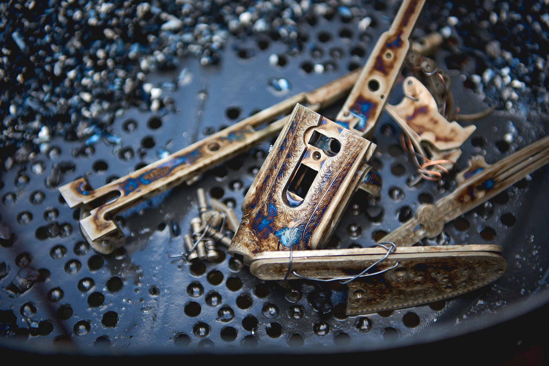 These are a unique pair of guns in A.A.Brown & Sons history, having been worked on by three generations of the Brown gun-making family. The first of these guns was a jointed action in the white waiting for a customer and so had been worked on by both Albert H Brown who jointed in and fitted the lever-work on 79774 and Sidney C Brown who made the sidelocks, as well as Robin Brown who had worked on the original design and specification at that time. When the order did come for a pair, a second gun was made to the same specification, but by this time Albert had passed away and so Albert Royster jointed in and fitted the lever-work to 79775. These are the first Best guns made by the firm to be checkered and oil finished by Matthew Brown, making four members over the three generations to have had a hand in the manufacture. Over the course of building these guns, many people have been involved in their crafting. Chris Kay supplied the chopper lump tubes, Harold Scandrett machined the tubes, ribs and loop as well as machining all components, actions, fore ends, locks and trigger-plates and Tony Smith built up the barrels. At this stage Robin Brown then finished the chambers and rims, filed the actions and prepared for Proof testing before the Birmingham Proof Master proofed the guns with 2 ¾” chambers to 850 bar. Kristian Reilly fitted the locks to the actions, Robin then made and fitted all the mechanism and Haydn Hill carved the beads and shaped the actions to the 'ready for stocking' stage. The stocks were supplied by Jusuf Loznak and stocked by Romain Lepinois before they passed to Matthew Brown for checkering and finishing. Robin then smoothed and polished all the parts requiring engraving before passing them to John Barratt who was the engraver. The engraving is of A.A.Brown & Sons design in close collaboration with the client and the ovals are engraved with the family crests by Philip Duffill. Robin then performed a pre-hardening free and finish before colour case hardening the actions and parts and then coin finishing, lacquering and freeing the mechanism. The best black on the barrels was by Paul Stevens of Stevens & Johnston and the furniture was blacked by Richard and Bob of Ray St. Ledger & Sons. Robin then performed the final assembly and adjustments and then Matthew gave a final waxing to the wood before test firing and photography of the completed guns. This is an interesting story that happens to coincide with Matthew joining the firm as the fourth generation of the family to do so and also at a time when Matthew started photographing so many stages of gun manufacture. It is somewhat fitting that these guns are a 21st birthday present and represent a handing over of knowledge and traditions, not only in their making, but in their future use.