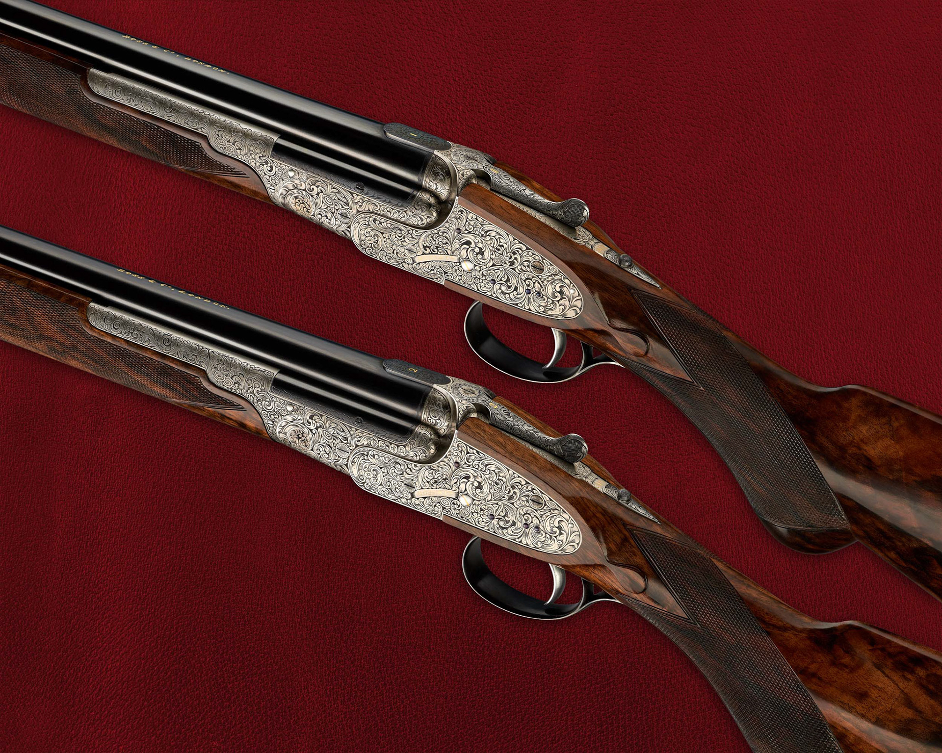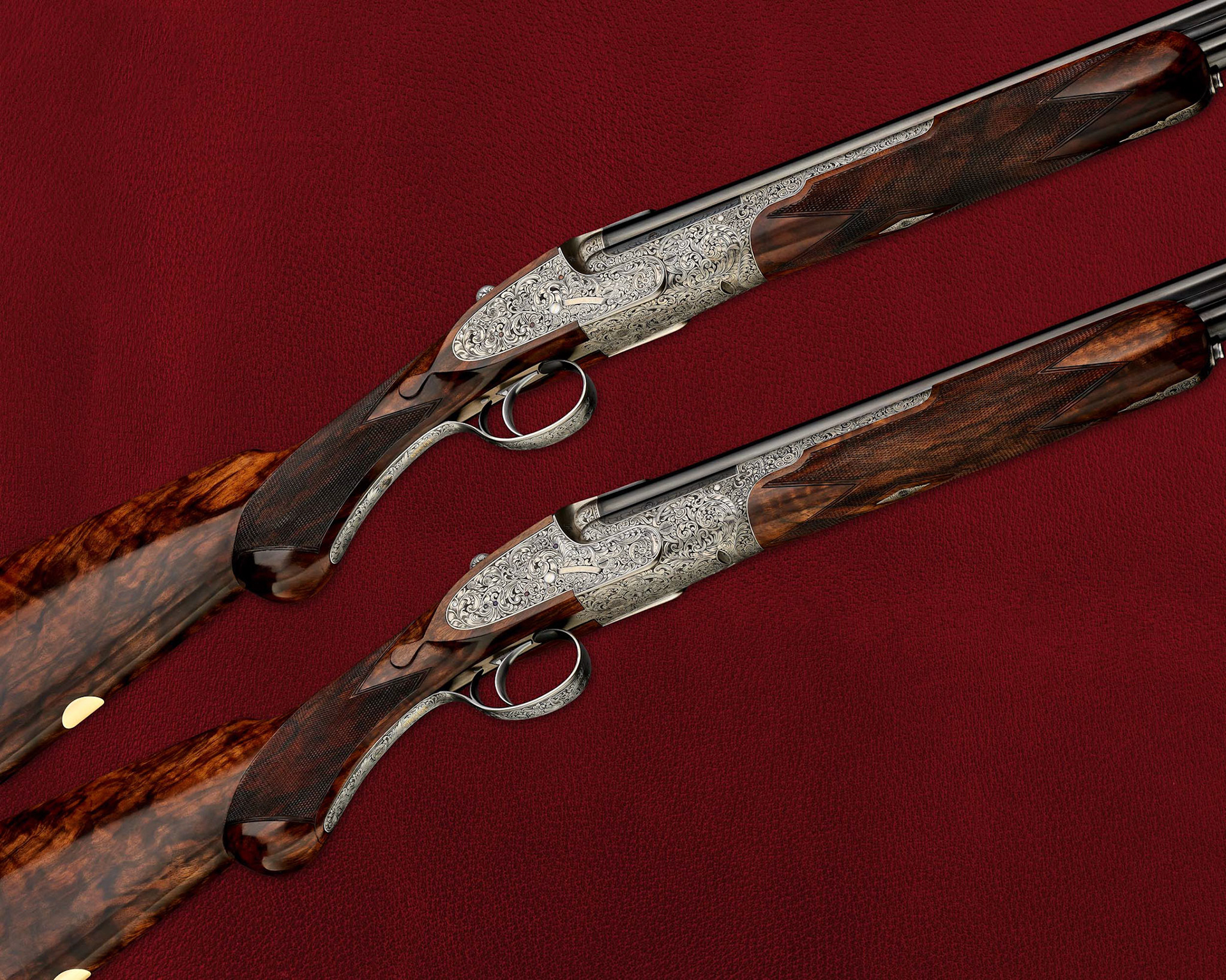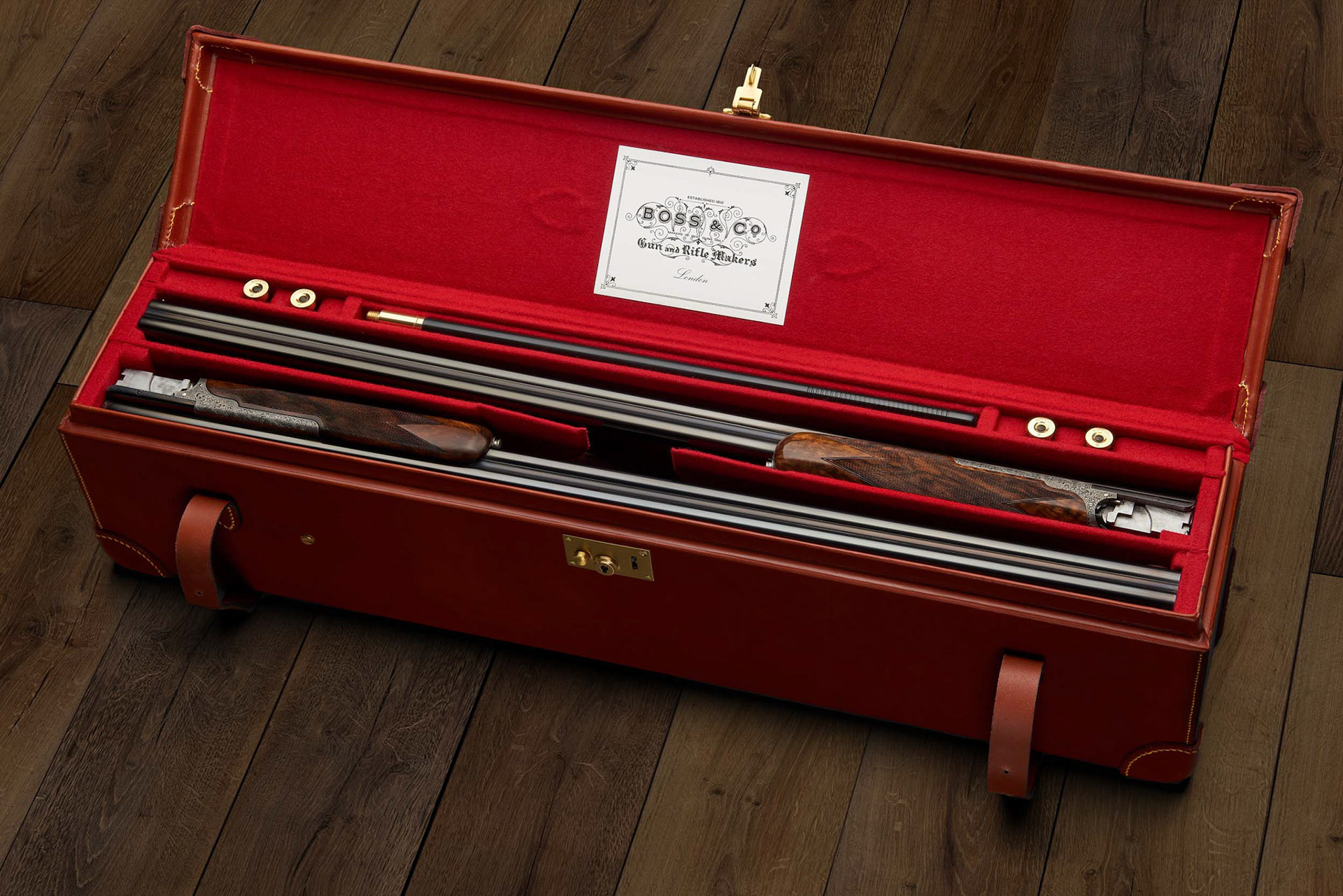 A pair of Boss & Co over & under 28 bore guns with coin finished actions and custom heavy scroll engraving.