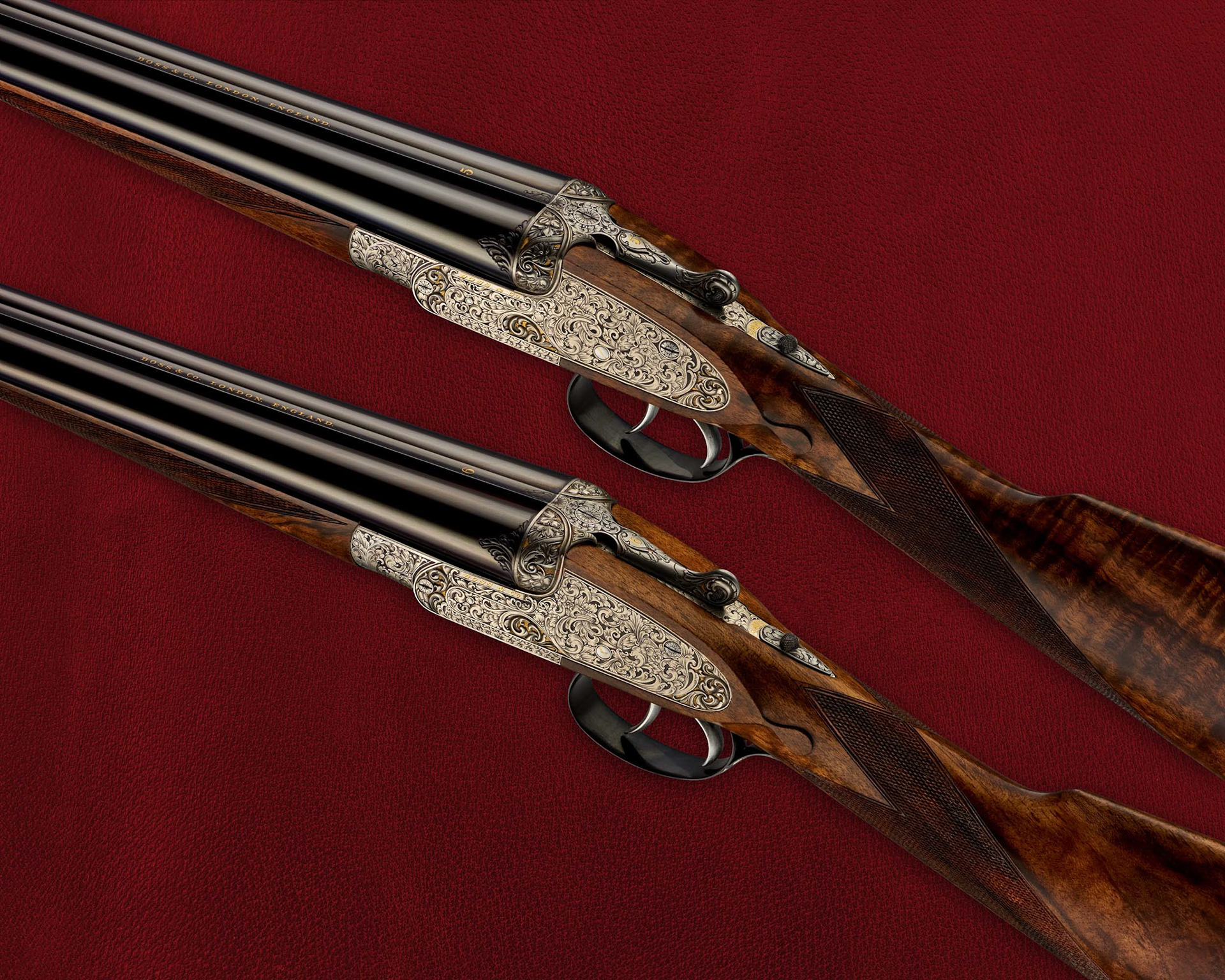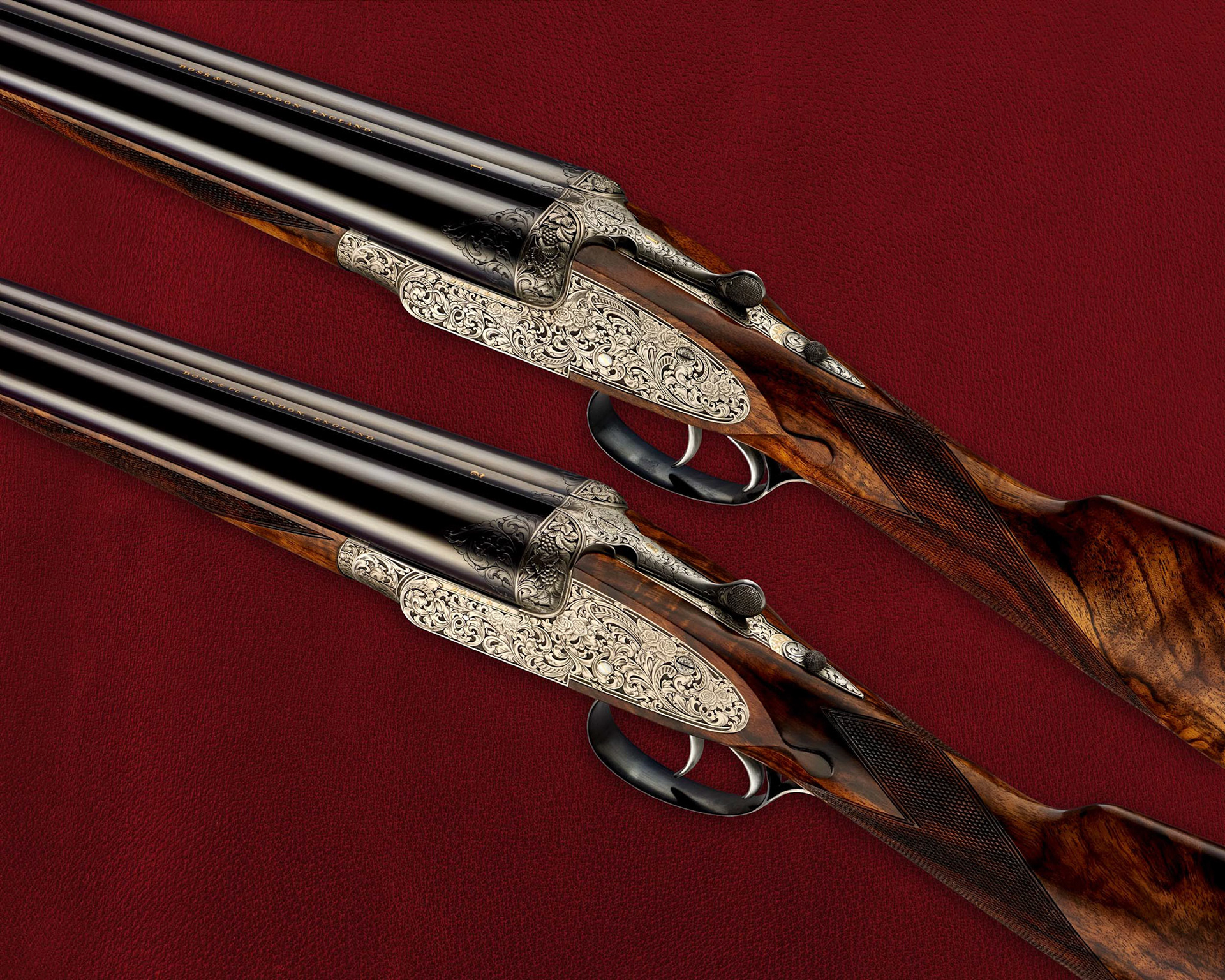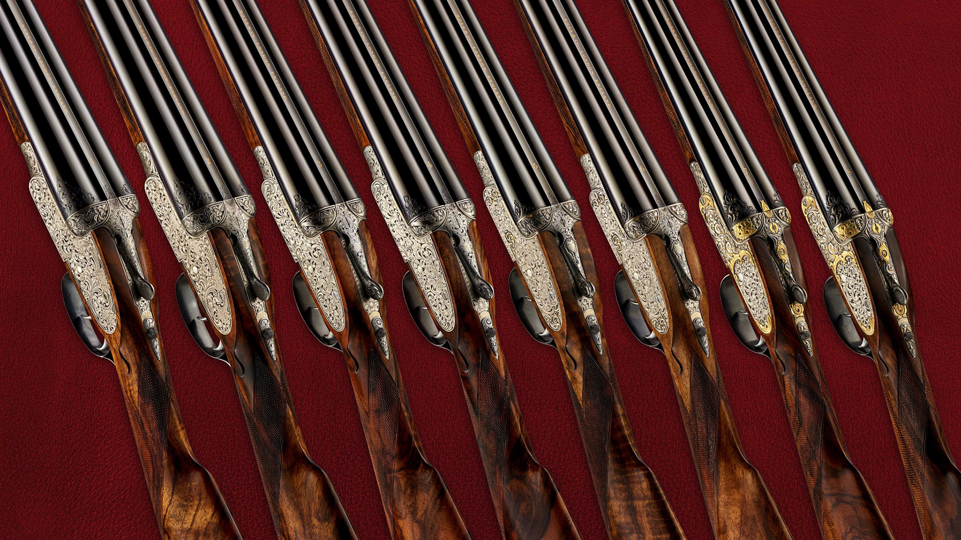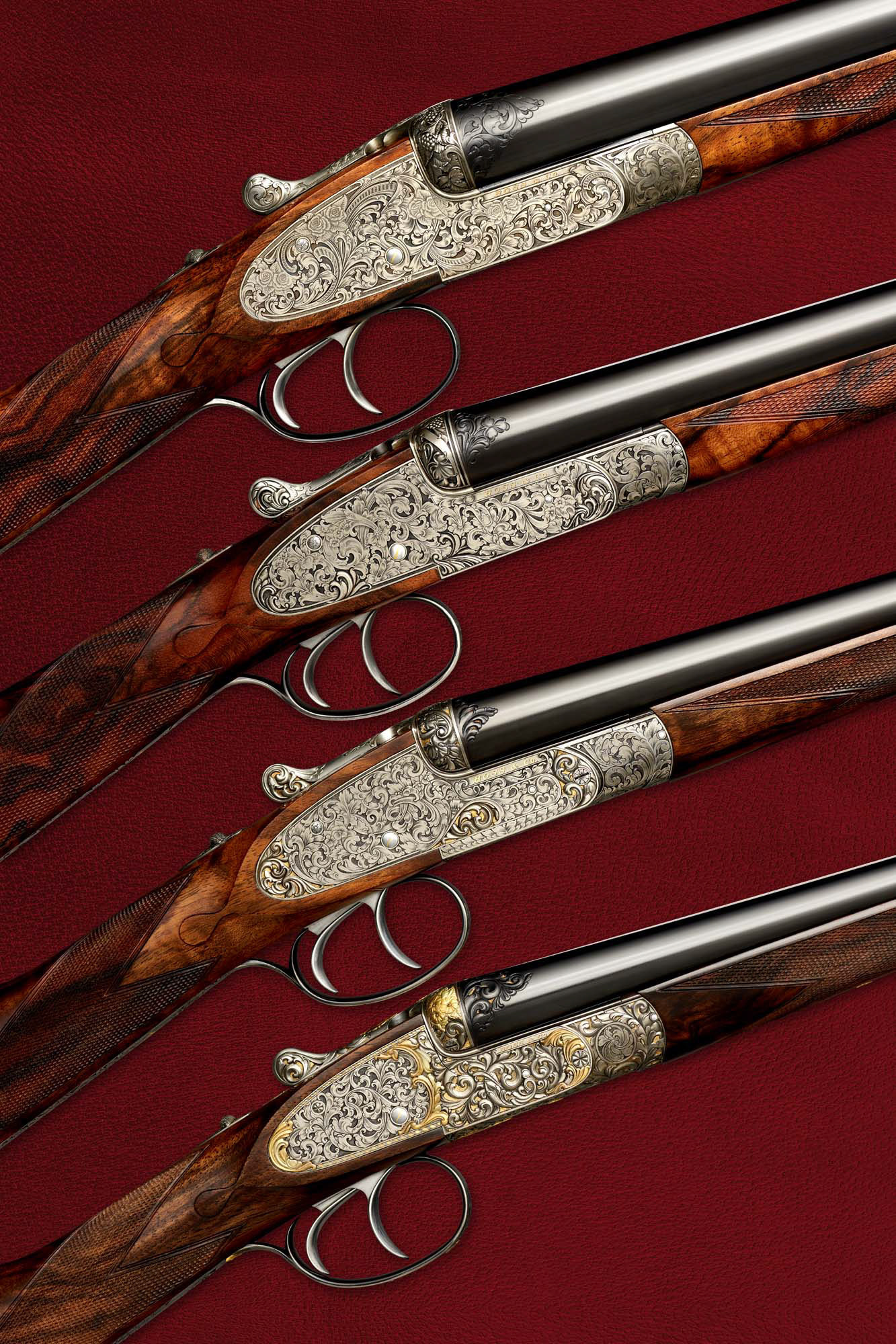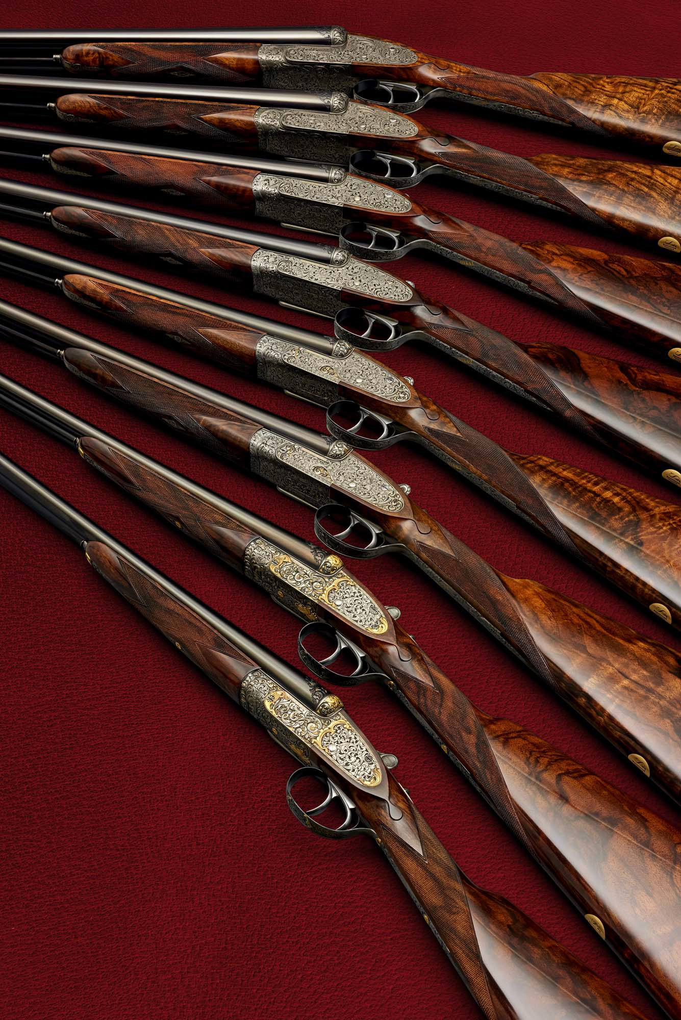 The Boss & Co flight of 8 side by sides. Engraved by Phil Coggan with more elaborate patterns as the calibre reduces, 12, 20, 28 and .410. To be joined by a second flight of over and under's in due course
