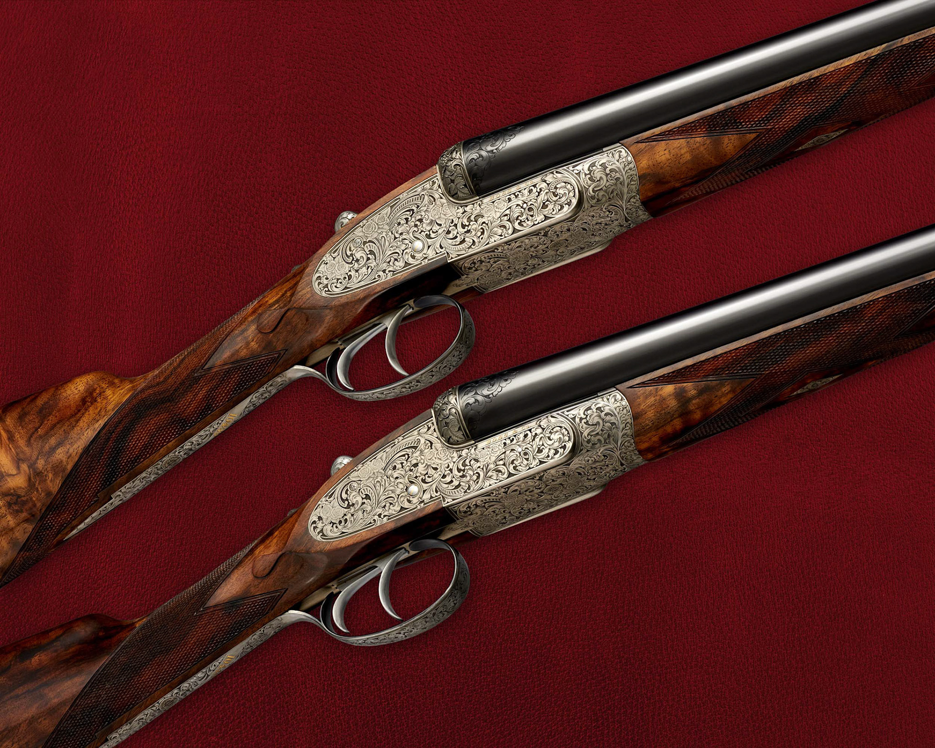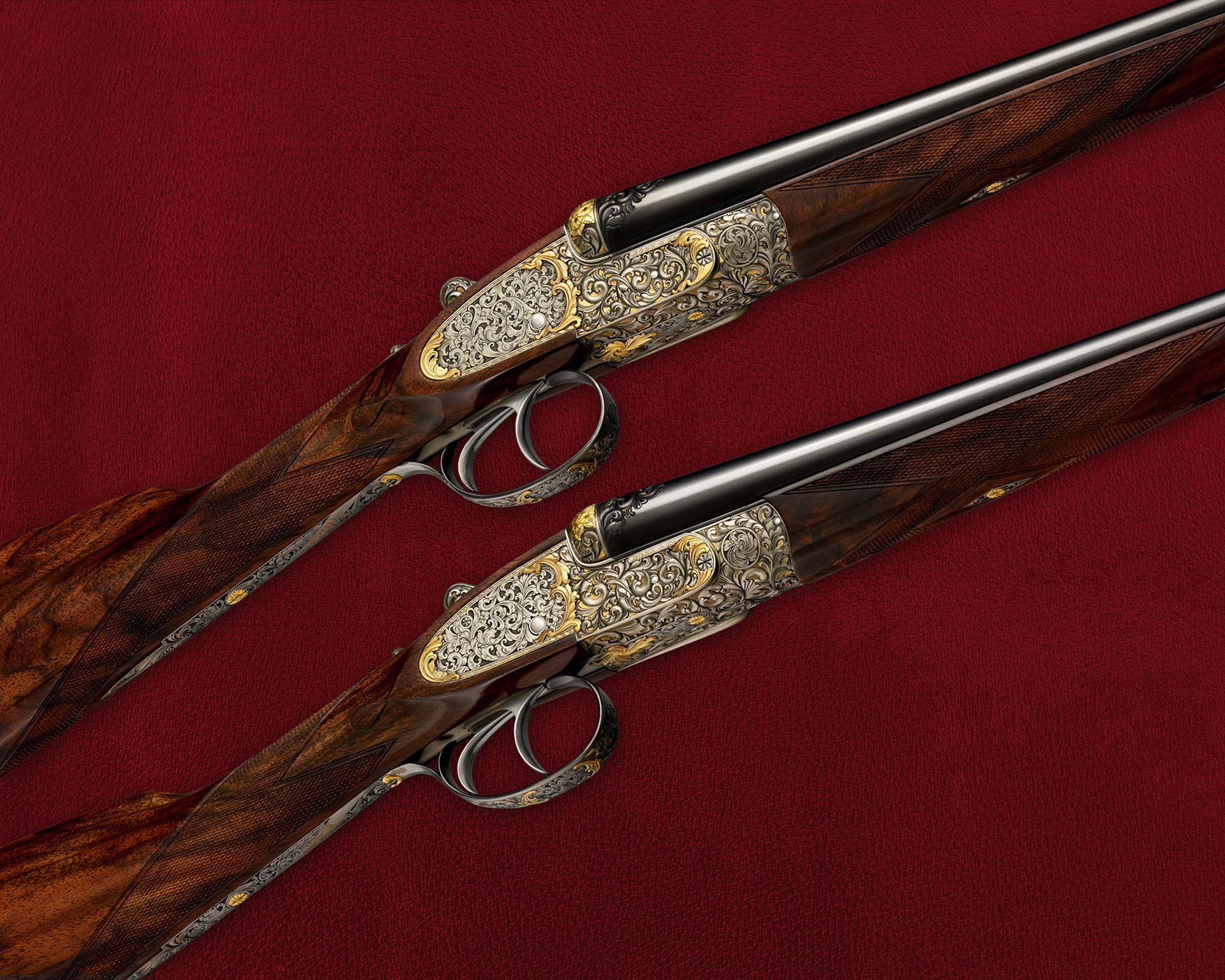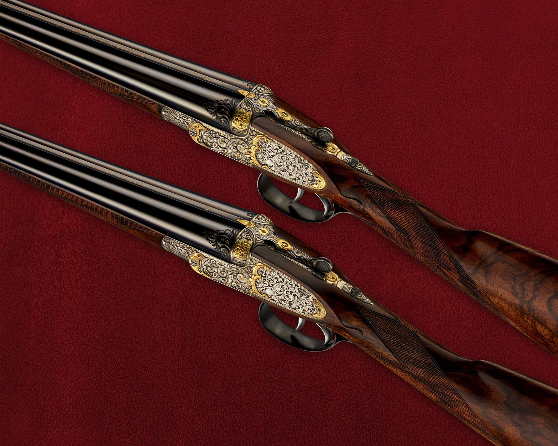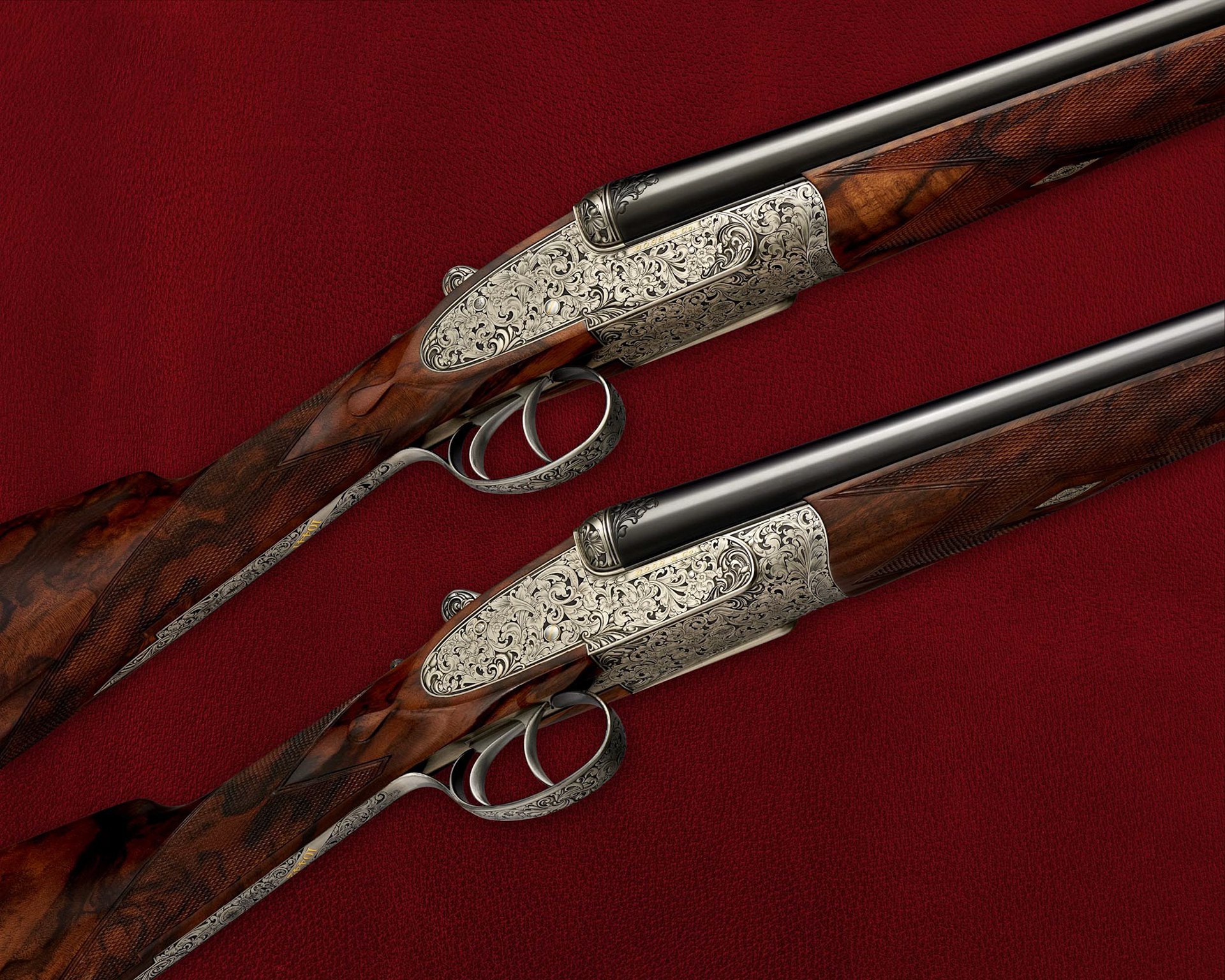 The Boss & Co flight of 8 side by sides. Engraved by Phil Coggan with more elaborate patterns as the calibre reduces, 12, 20, 28 and .410. To be joined by a second flight of over and under's in due course