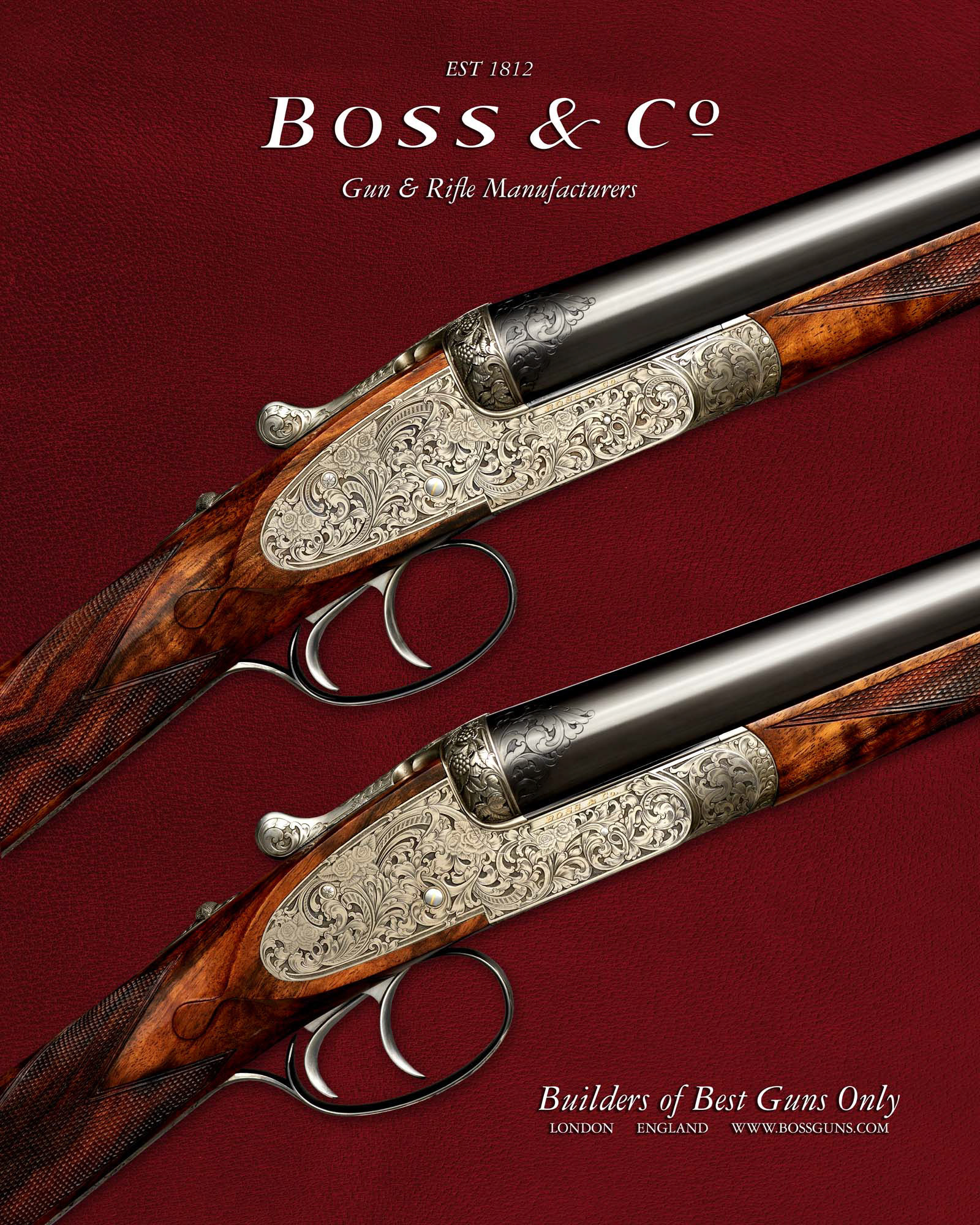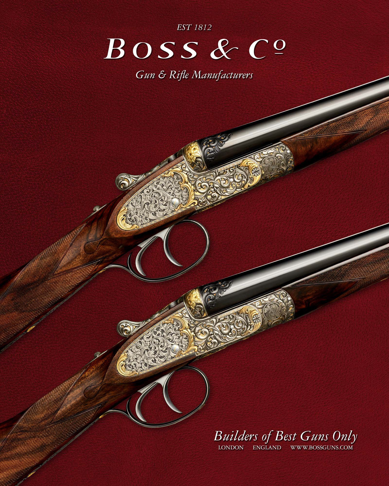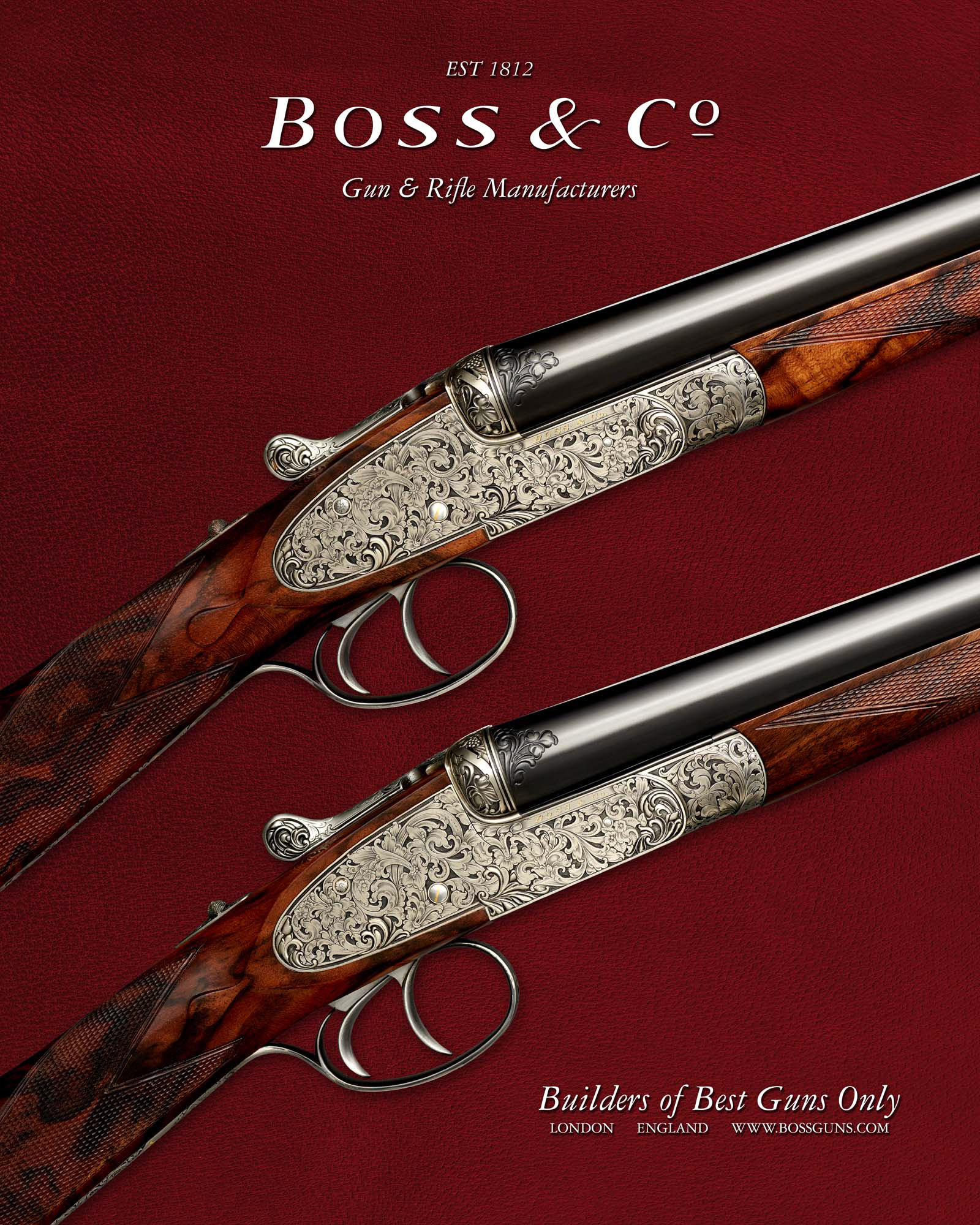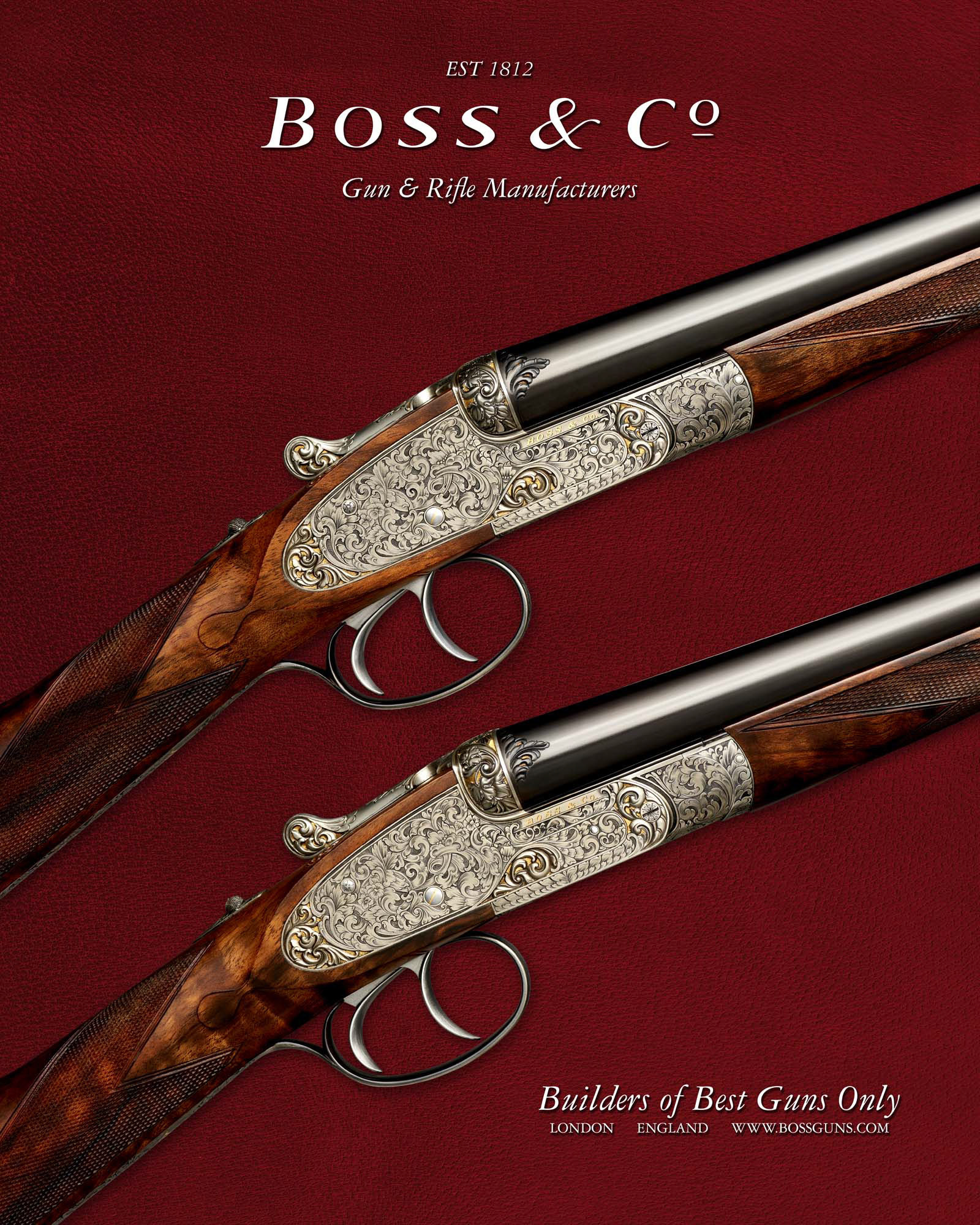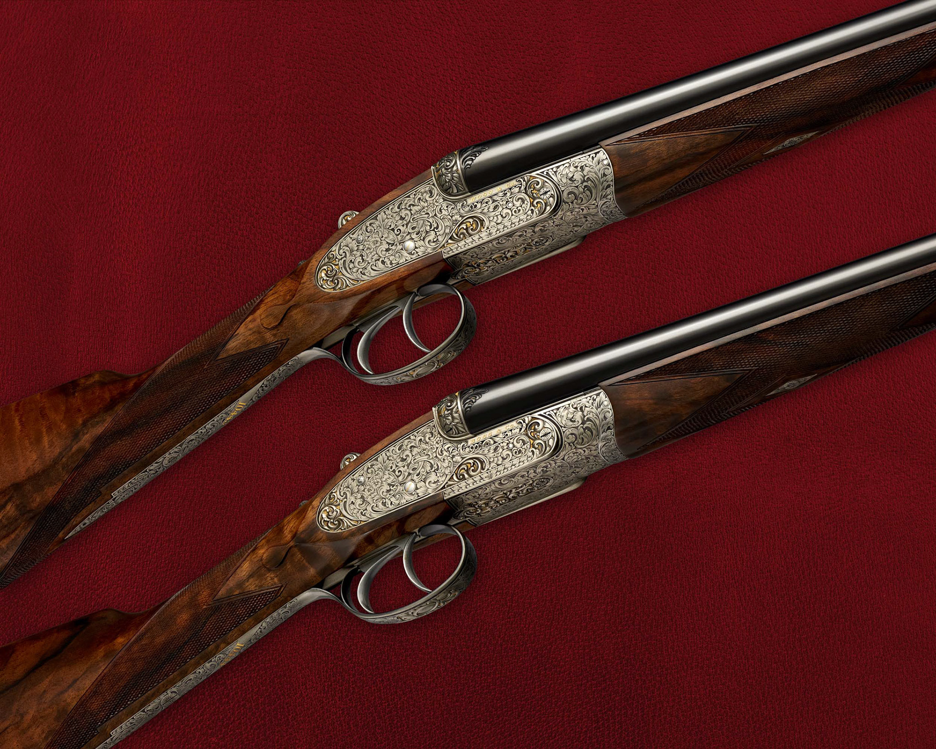 The Boss & Co flight of 8 side by sides. Engraved by Phil Coggan with more elaborate patterns as the calibre reduces, 12, 20, 28 and .410. To be joined by a second flight of over and under's in due course