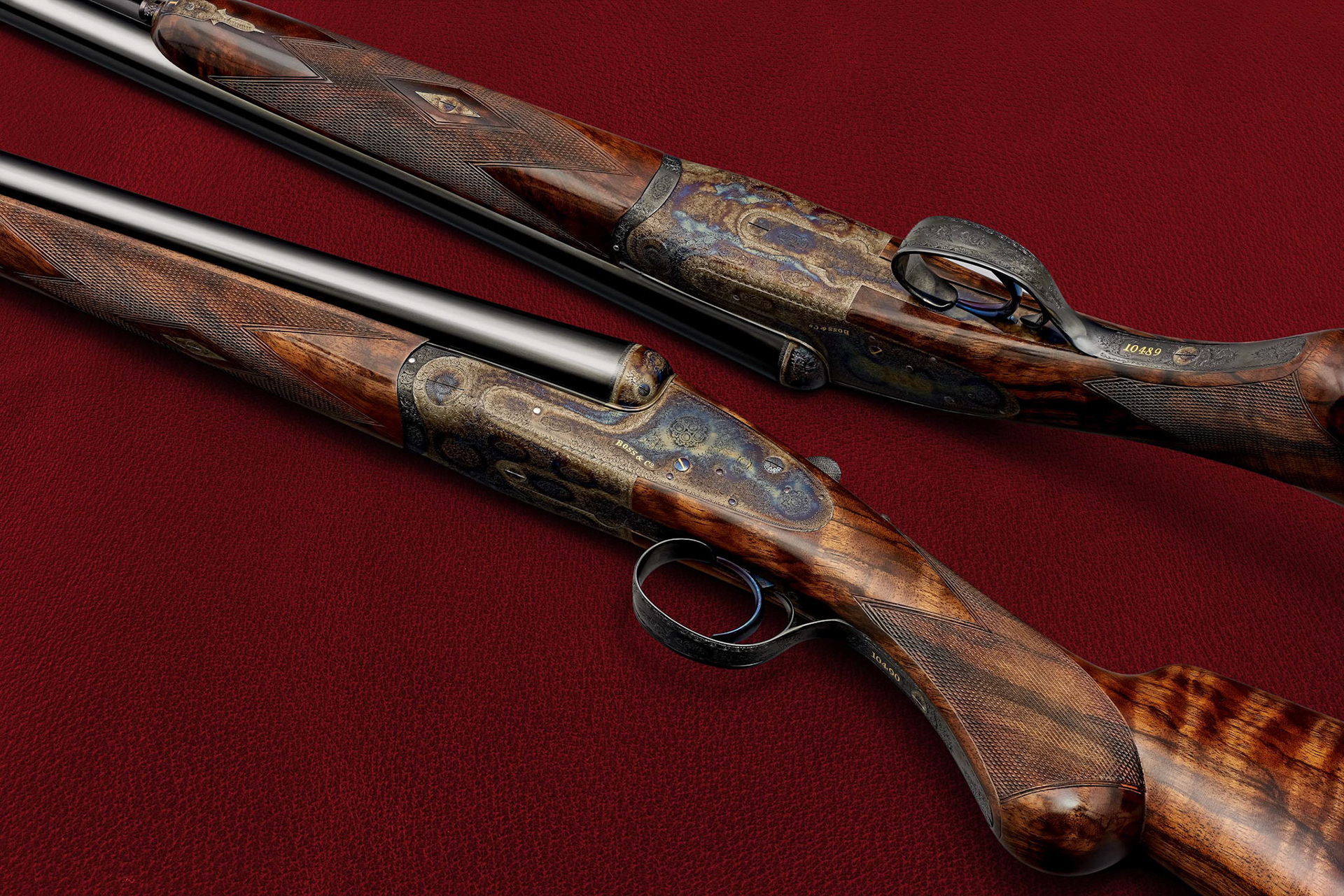 A pair of Boss & Co side by side round action sidelocks, colour hardened and with rose and scroll engraving. Photographs commissioned by the maker