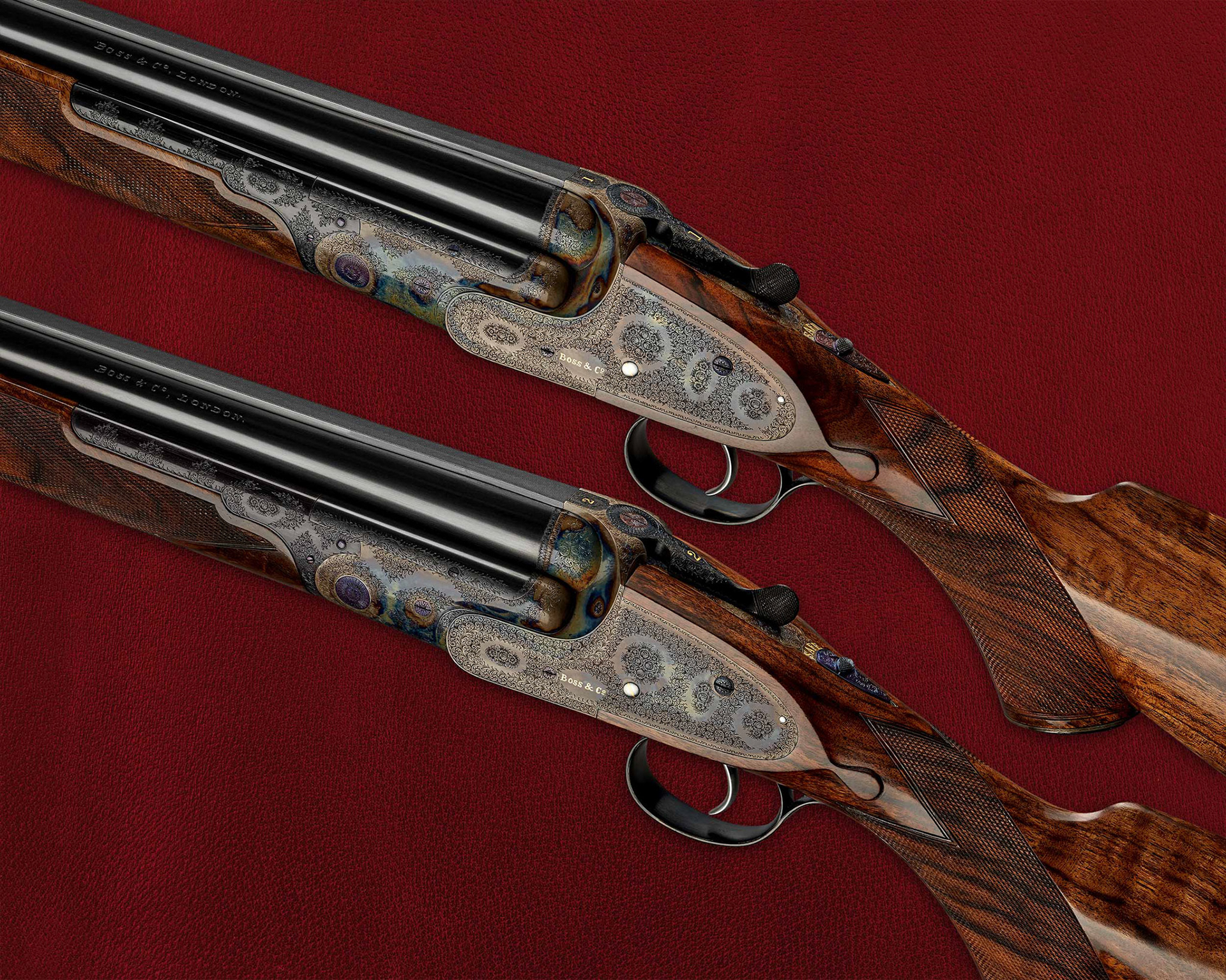 A Boss & Co 12 bore Over & Under pair with colour hardened square actions and rose & scroll engraving by David Tallett. Also featuring a full top rib and a grip cap.