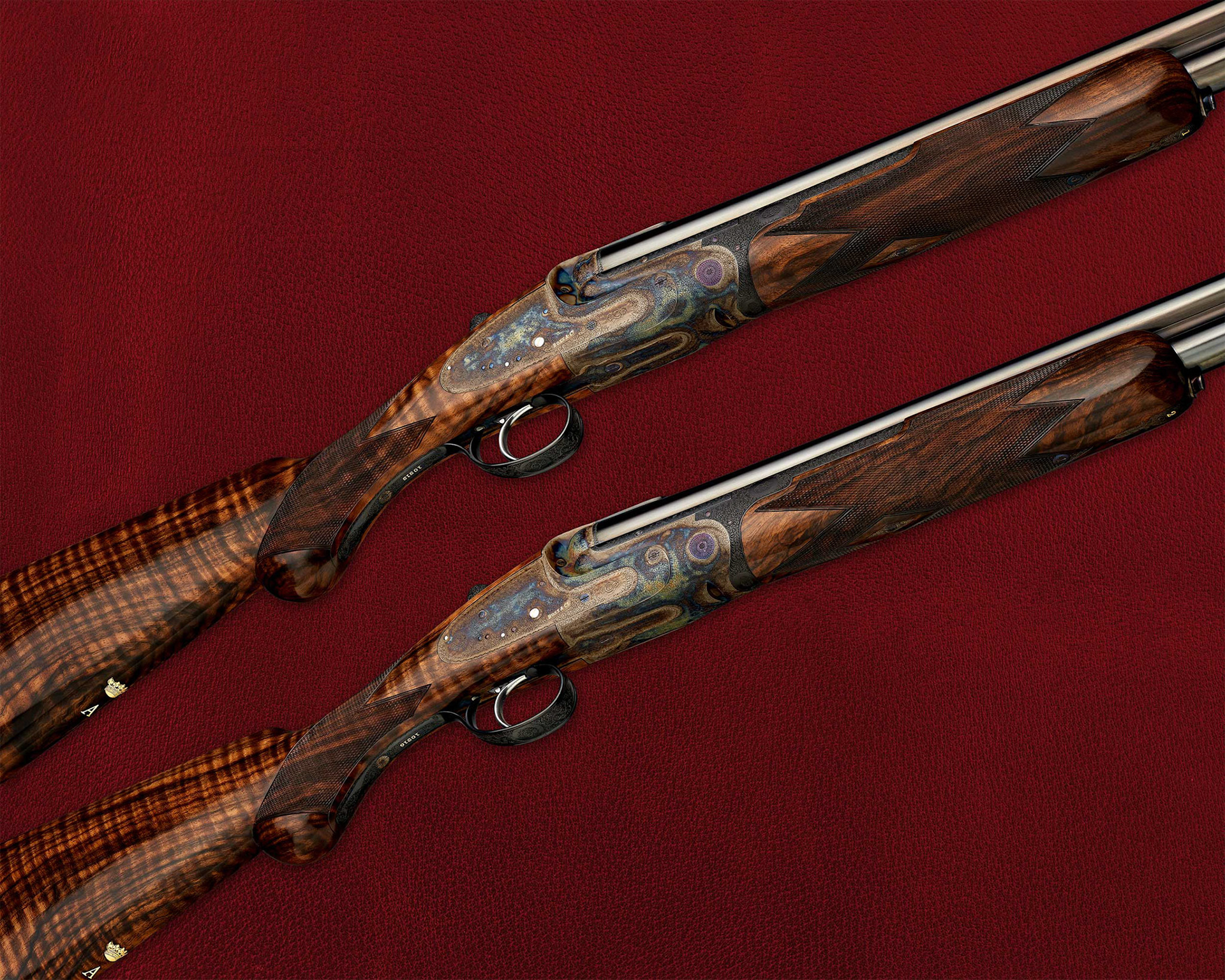 A pair of 12 bore Boss & Co over & under shotguns with rose & scroll engraving and round actions.