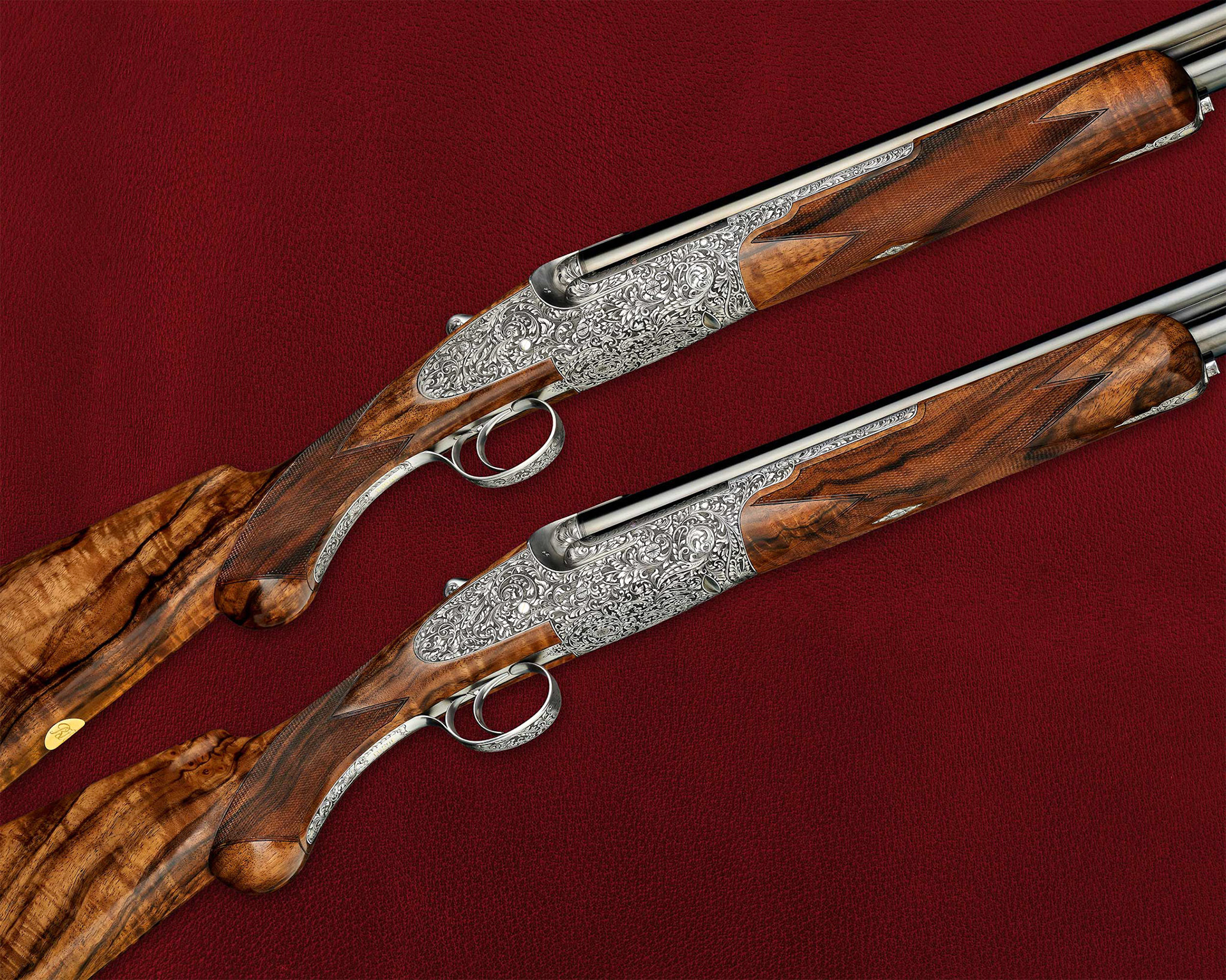 A 16 bore over & under pair with custom carved and monogrammed engraving.