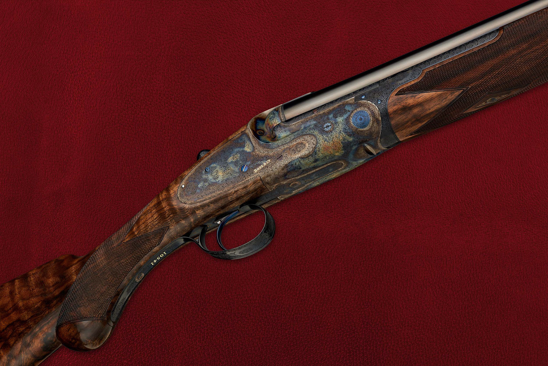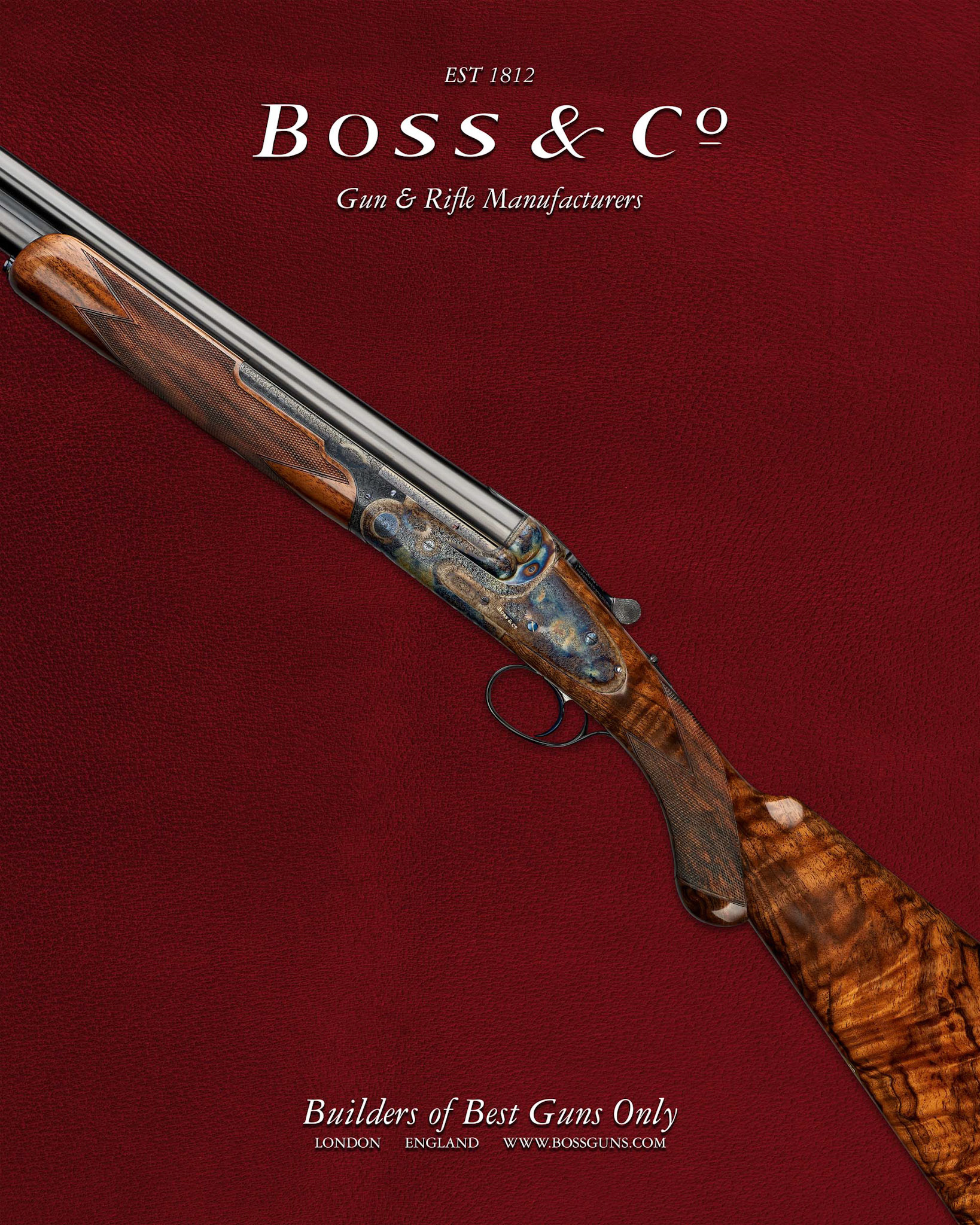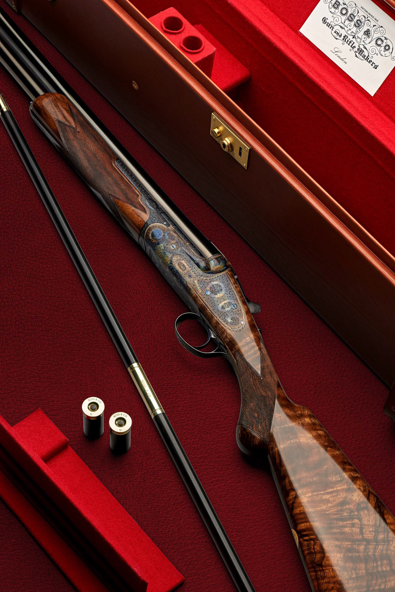 A Boss & Co over & under 12 bore round action, colour hardened with rose & scroll engraving and a leather motor case.