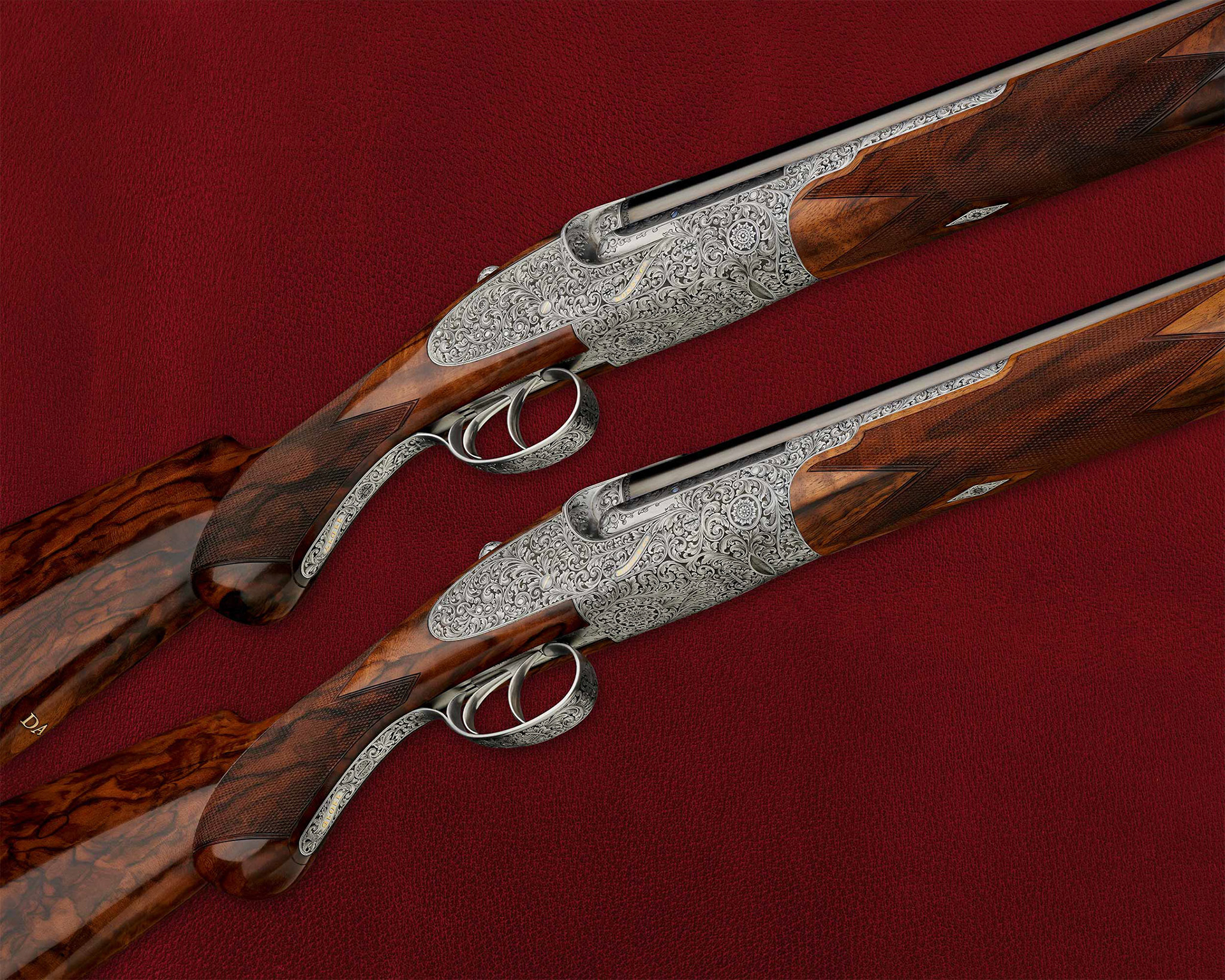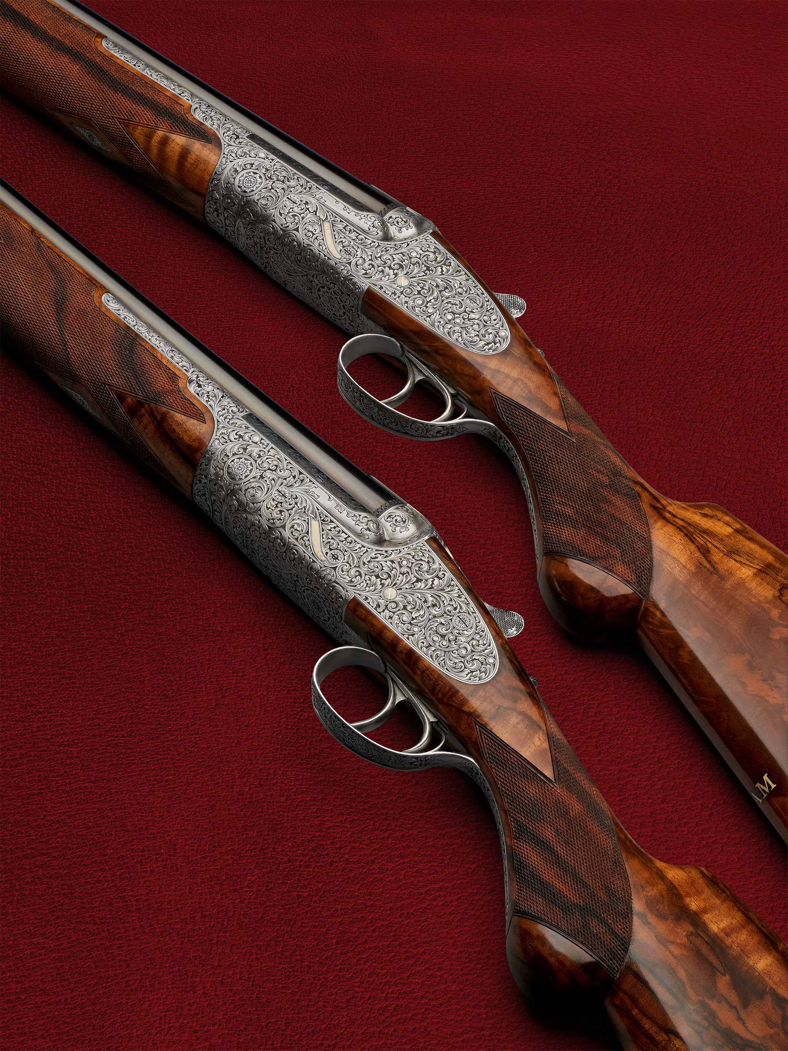 A coin finished over & under pair of Boss & Co shotguns in 20 bore with a round action and cutaway school engraving.