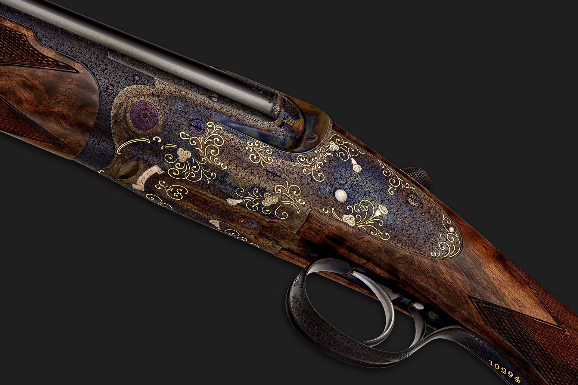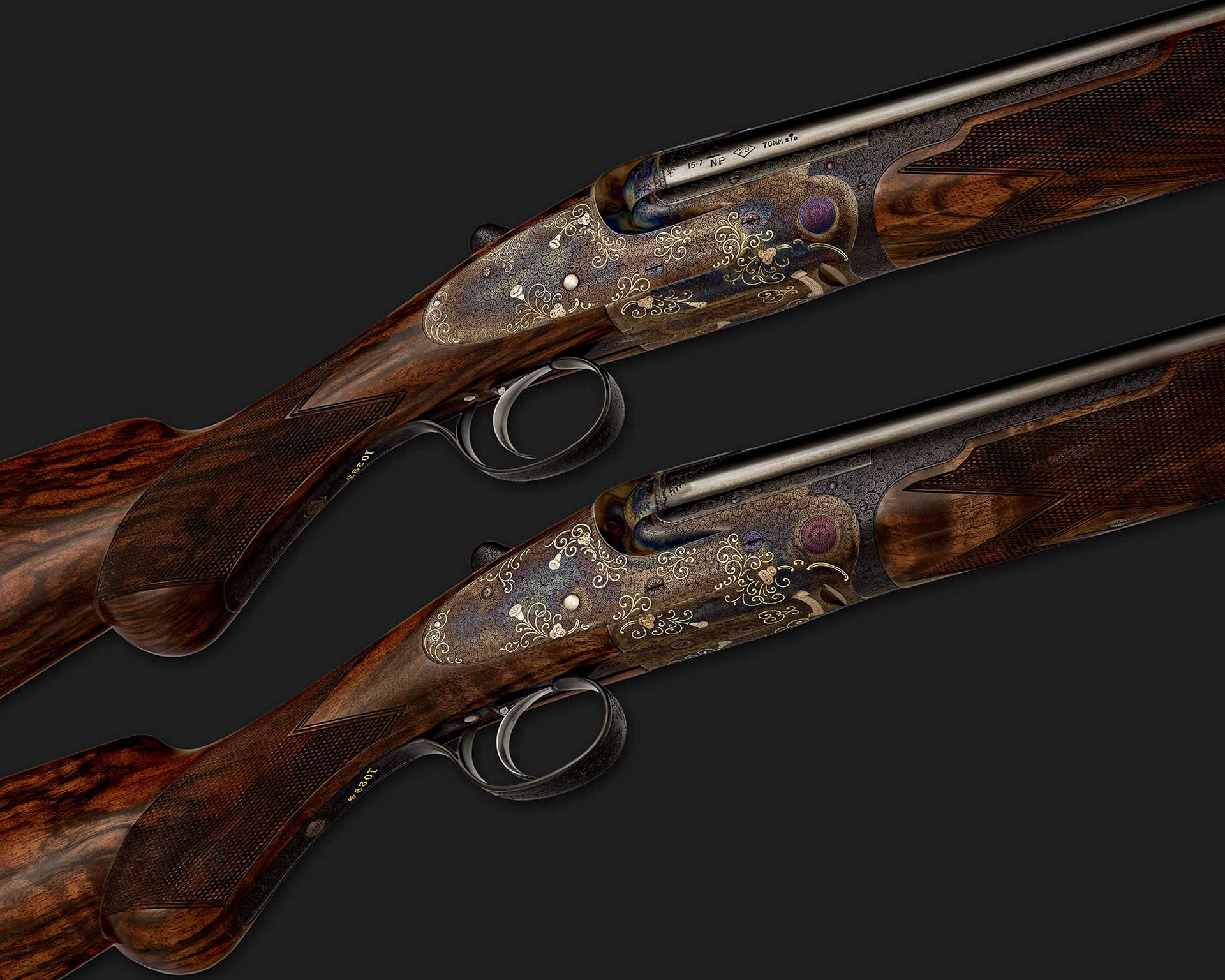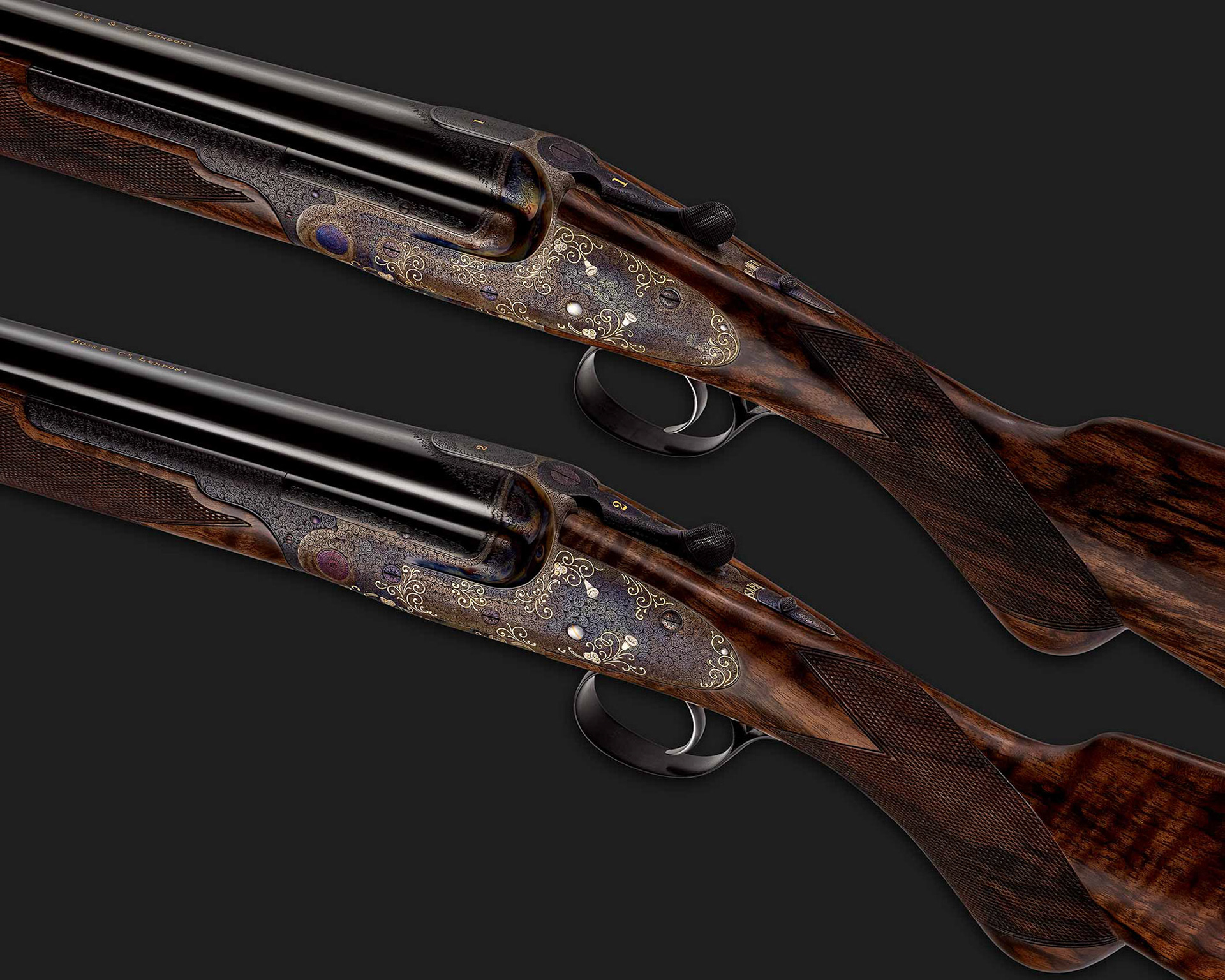 A pair of Boss & Co over & under sidelocks with fine gold inlaying with a rose and scroll engraving pattern on colour hardened round actions. Photographed for the maker