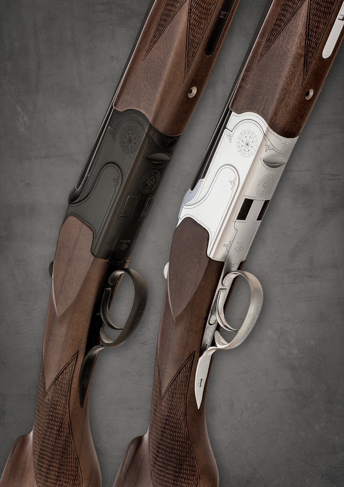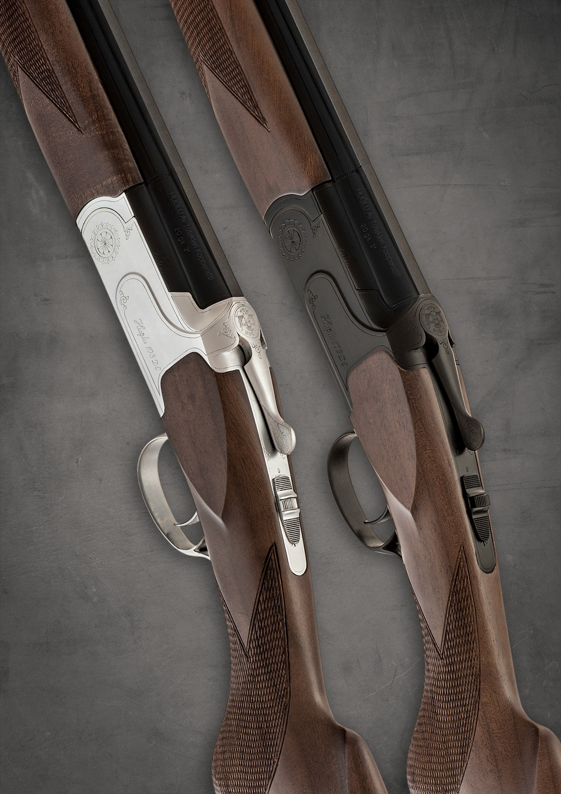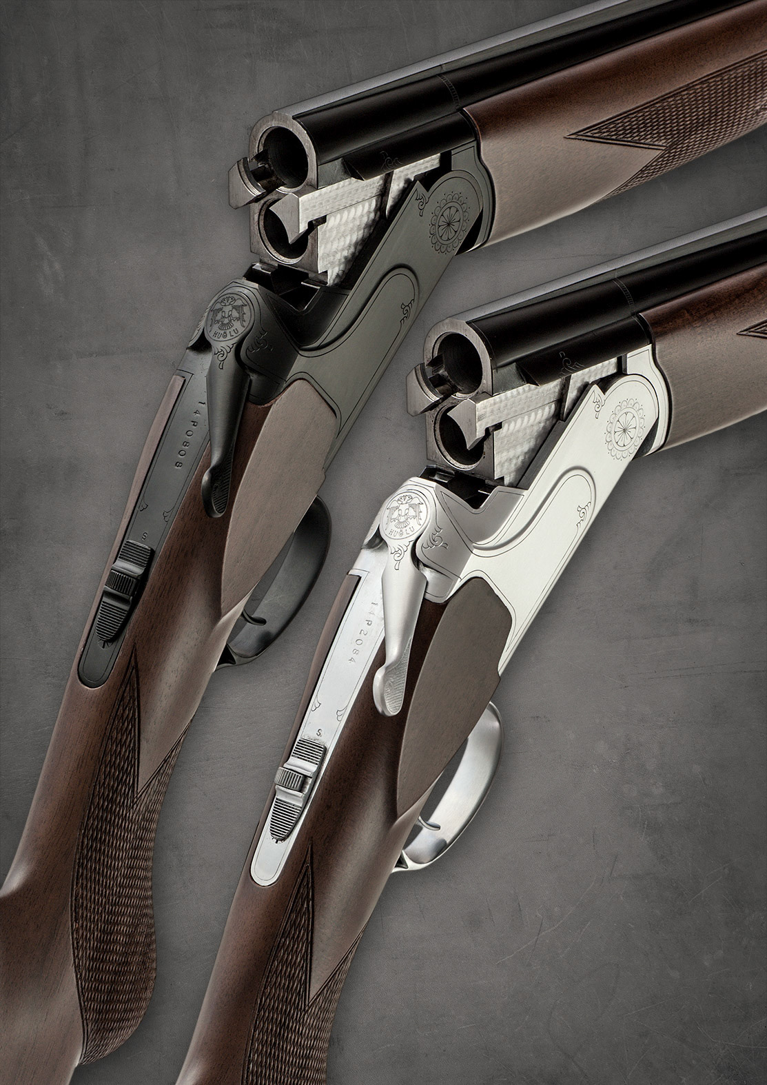 A set of Huglu over & under shotguns with black and silver actions